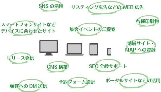 弊社は、スマートフォンサイトを始めとするサイト制作からDMハガキの作成・発送代行まで、ご希望に応じた様々な業務を体系的にご提供しています。